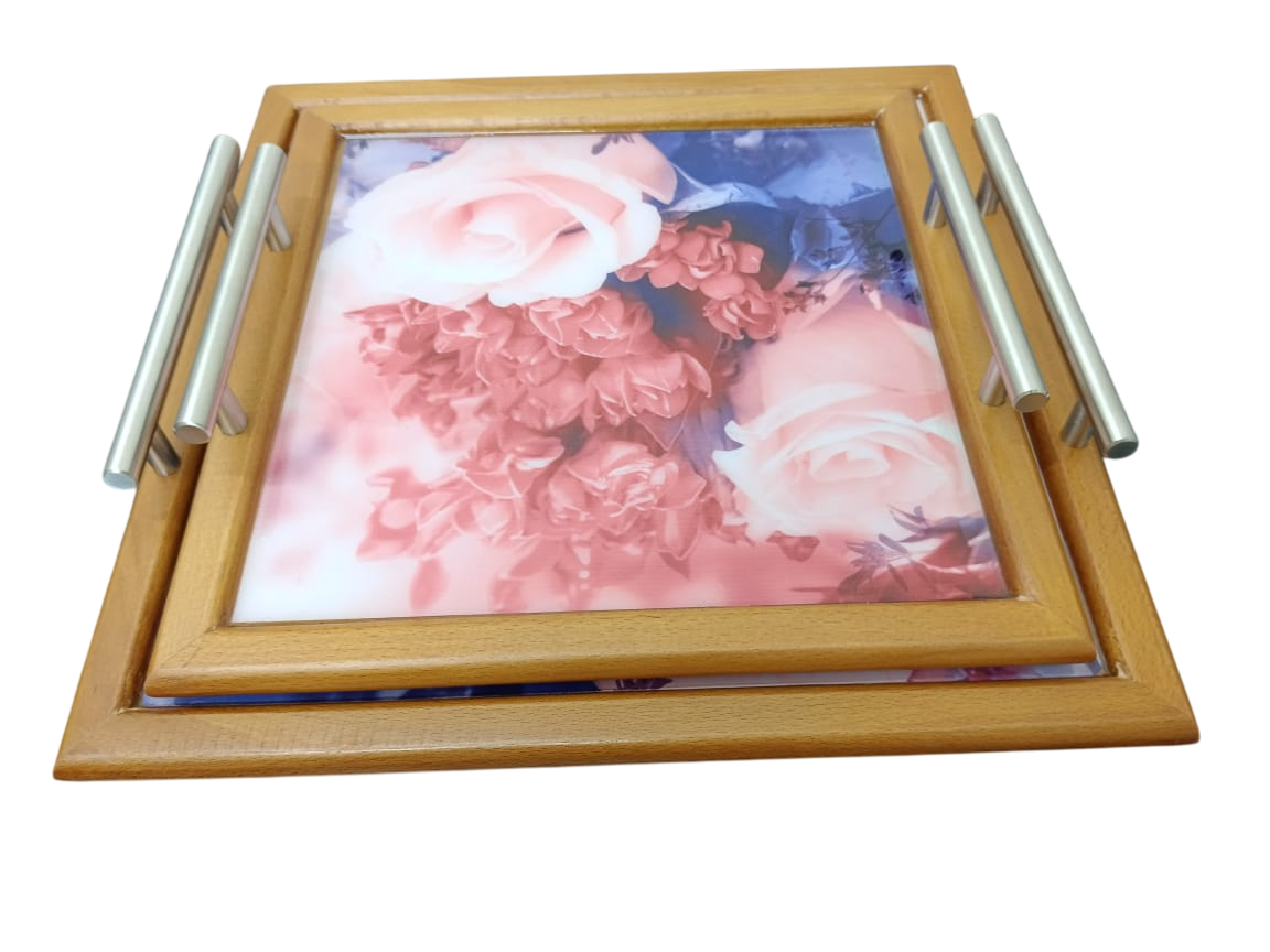 Design: Features a natural wood-colored frame with a built-in floral pattern in the center and metal handles (often silver or gold) for easy carrying.