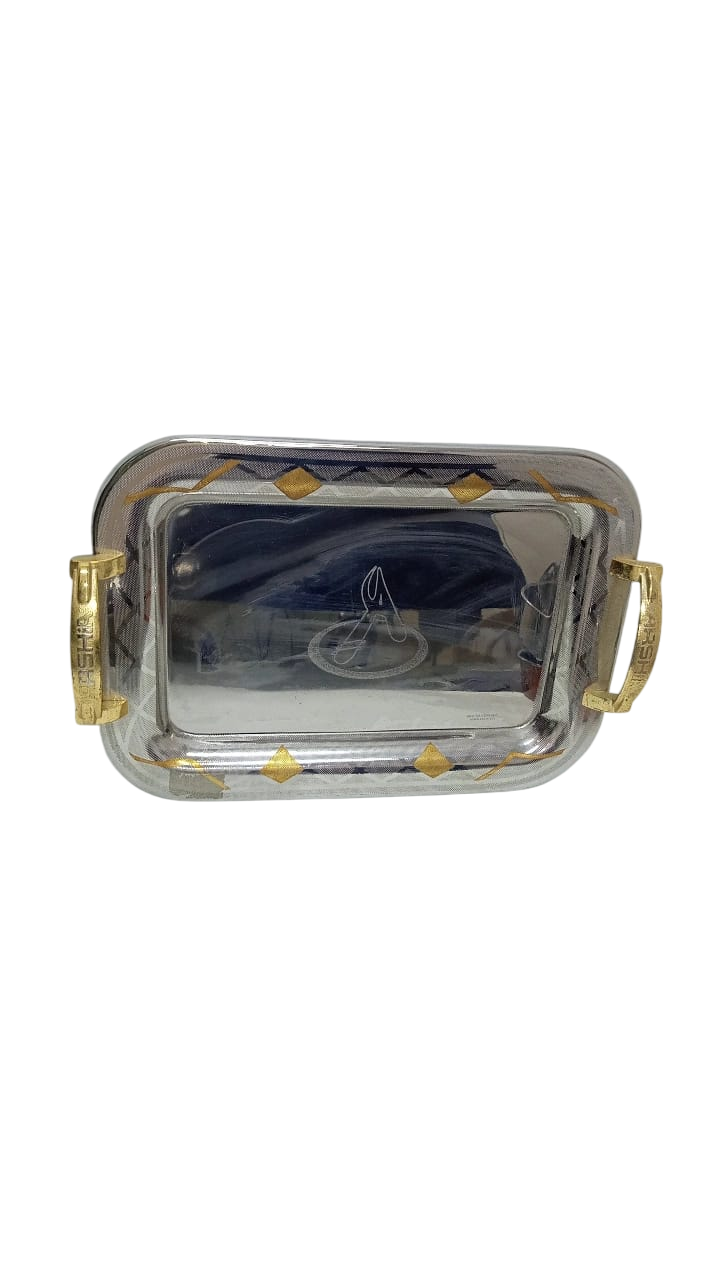 Design: Features a shiny silver surface with decorative edges featuring geometric patterns plated in gold, and comfortable gold handles for easy carrying and serving.