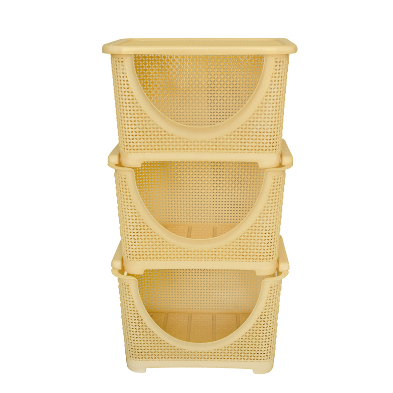 a 3-tier stackable plastic storage unit, often called a turbo or trolley, which features three open-front bins. These units are made from durable plastic, typically polypropylene (PP), with an openwork ‘rattan effect’ or ‘arabesque’ lattice design that allows for ventilation