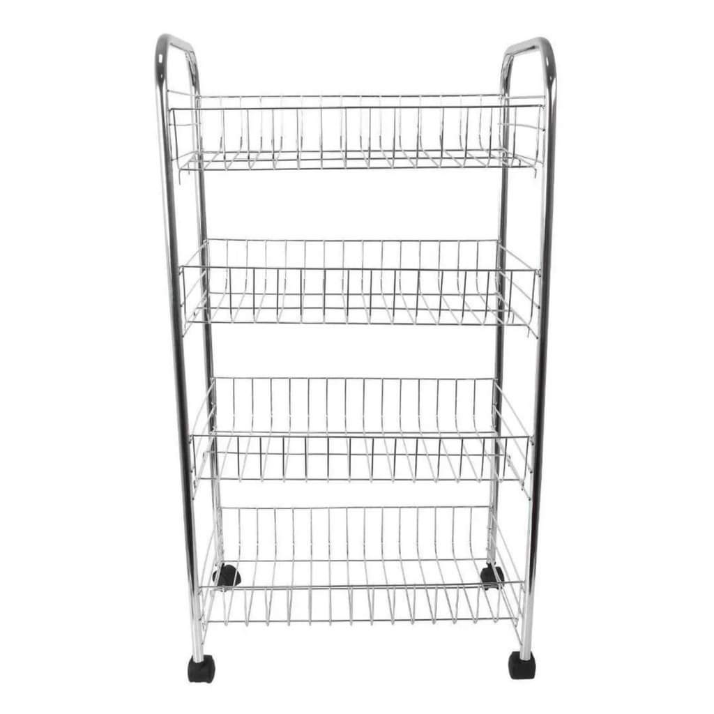 four-tier metal wire rolling cart, often called a kitchen trolley or vegetable rack. It is designed to provide mobile storage solutions in various areas of the home, such as the kitchen, bathroom, office, or garage.