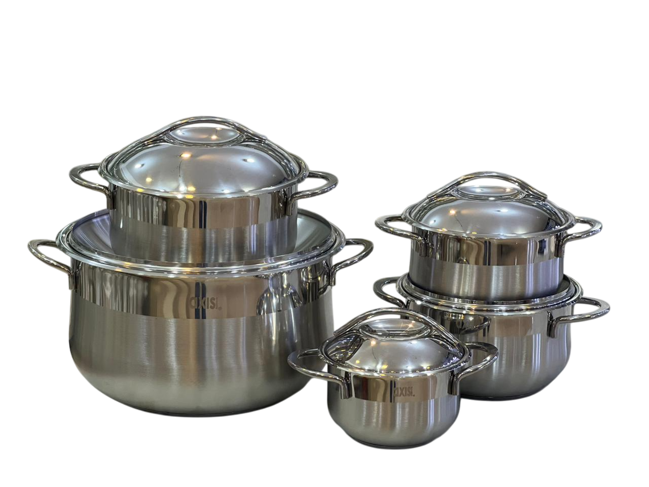 A stainless steel cookware set, known for its distinctive “Bombay” design.