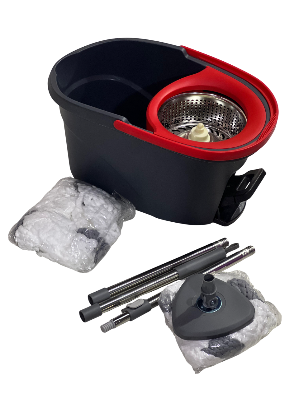 Spin Mop Bucket: A durable black bucket with a red wringing basket. The wringer is typically operated by a high-quality foot pedal, allowing you to control the mop’s moisture level without bending over or touching dirty water.
