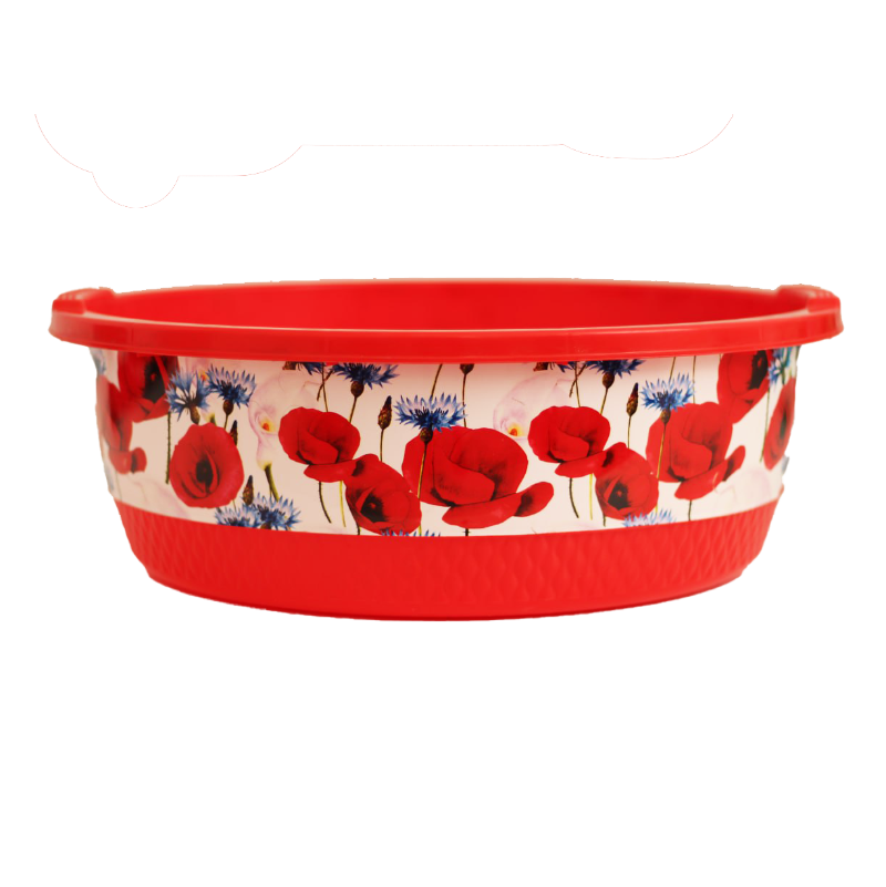 a round plastic washing basin featuring a distinctive red poppy floral design around the exterior. It is a multi-purpose household product used for washing clothes, dishes, or general household chores.