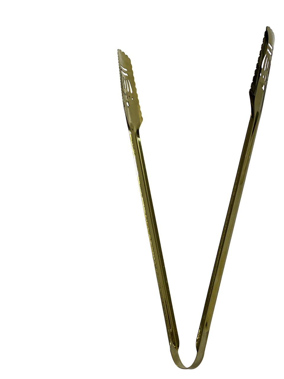 This image shows gold-plated stainless steel food tongs, a versatile kitchen tool used for serving a variety of foods such as ice, salad, pastries, and appetizers. These tongs are popular in both homes and restaurants thanks to their elegant design and durability.