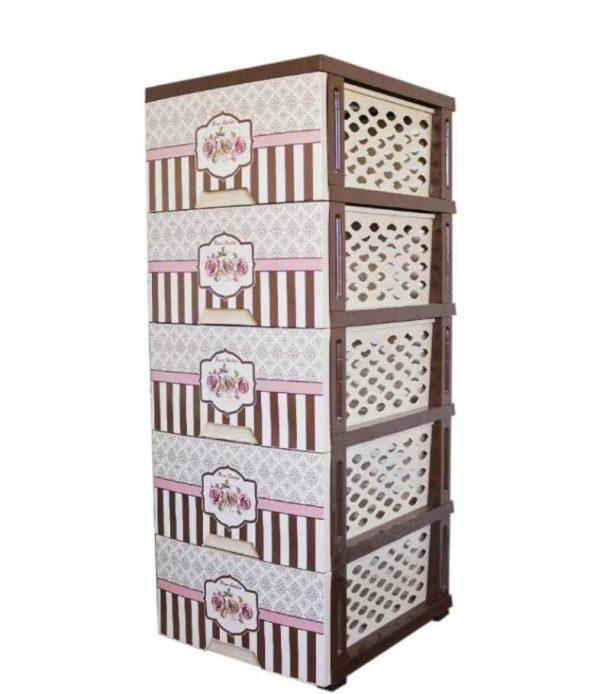 A 5-drawer plastic storage unit. This unit features a brown and beige color scheme with a decorative floral pattern and pink lines on the drawer fronts, adding a touch of elegance to any space.
